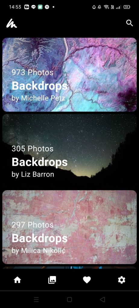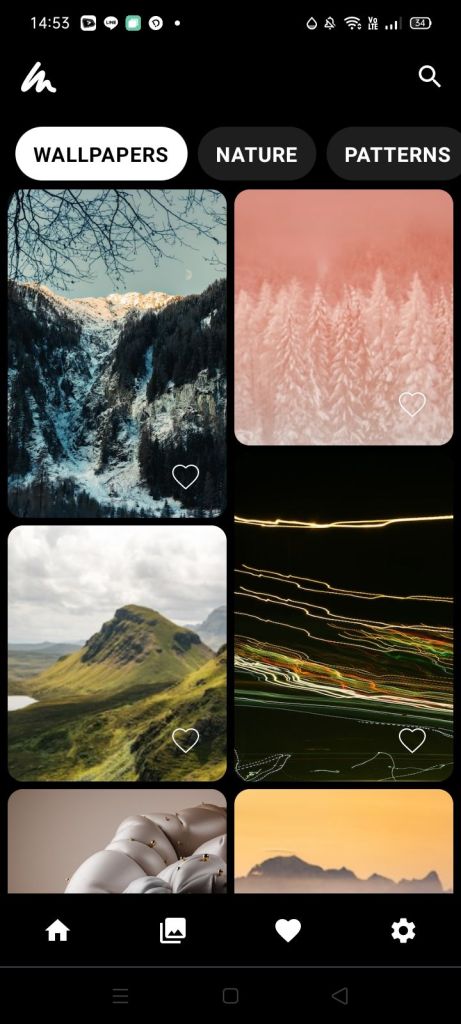 Of course the homepage contains a beautiful wallpapers done by professional photographers at Unsplash. Com, the app has a ton of wallpapers in different topics such as nature, patterns, film, street, experimental, travel, animal and art.